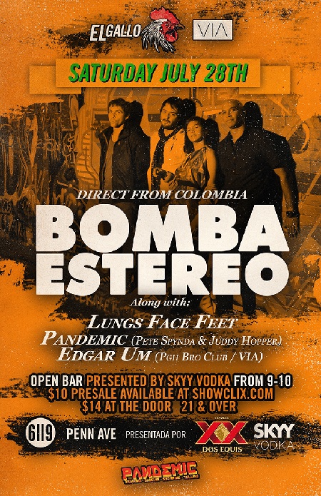 THEN WE HAVE BOMBA ESTEREO on JULY 28 @ 6119 PENN AVE, brought to you buy the ROUND CORNER CANTINA, VIA, and us…(PANDEMIC)