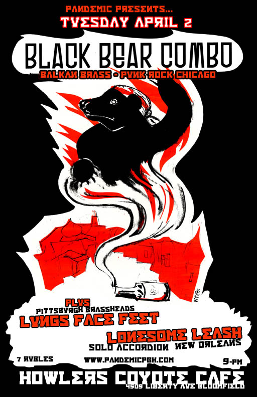 Black Bear Combo is a four to six member brass/reed band. Our sound is a raucous mutt channeling the common energy between traditional music from eastern Europe and the Balkans, punk rock, and free jazz. Since 2002 we’ve brought our sound to clubs, basements, festivals, weddings, funerals, parties and streetcorners across the country.