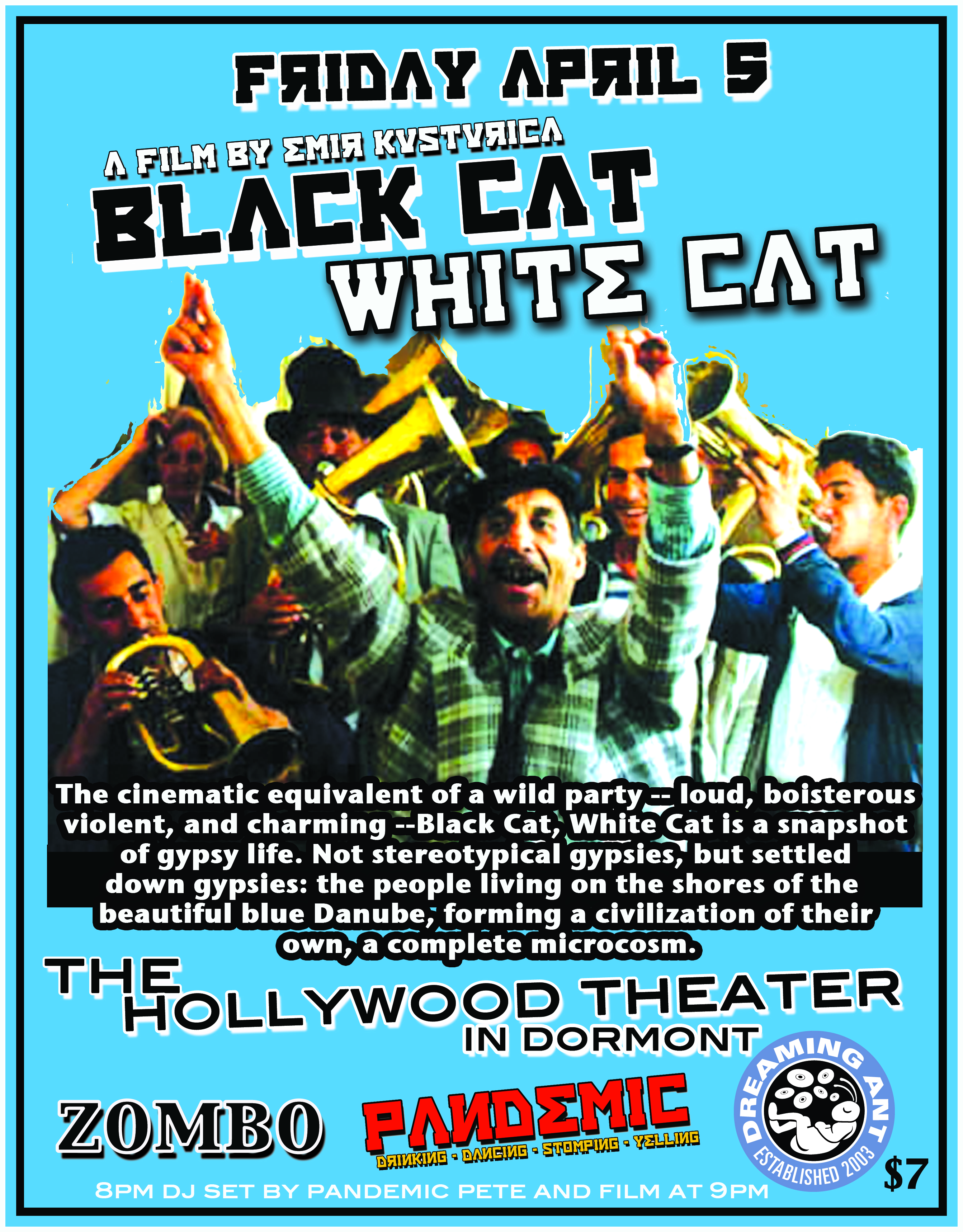 FRIDAY APRIL 5 we are copresenting Emir Kusturica‘s film BLACK CAT WHITE CAT at the HOLLYWOOD THEATER in DORMONT with ZOMBO and The Dreaming Ant. Can’t wait to see that on the big screen! Also APRIL 5 PANDEMIC will be the official AFTERPARTY!!!!